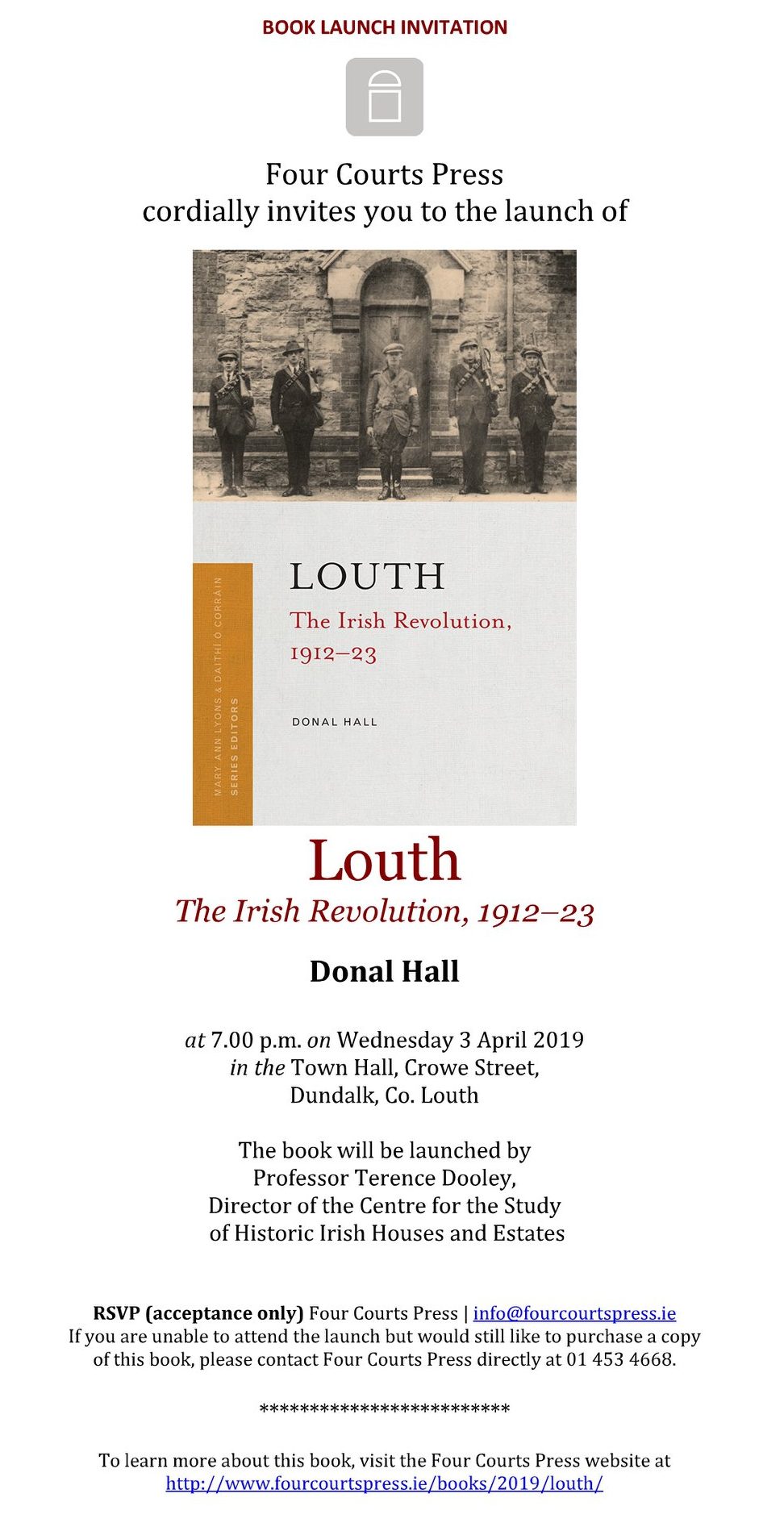 Louth: The Irish Revolution, 1912-23 by Donal Hall will be launched in Dundalk on Wednesday 3rd April by Professor Terence Dooley. See details below.